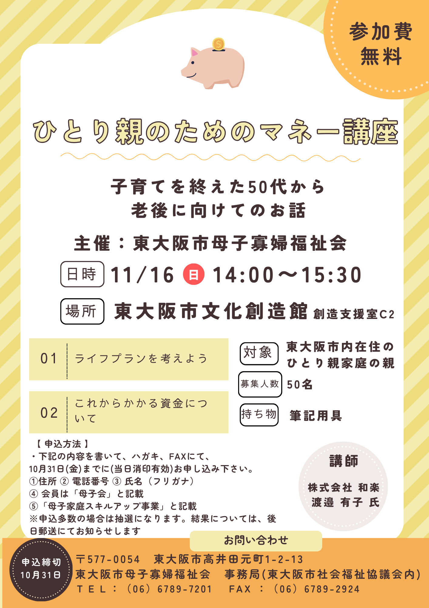11/16(日)母子家庭スキルアップ研修を開催します。今回は、ひとり親家庭のためのマネー講座となっており、子育てを終えた後の資金管理についての講座となっております。